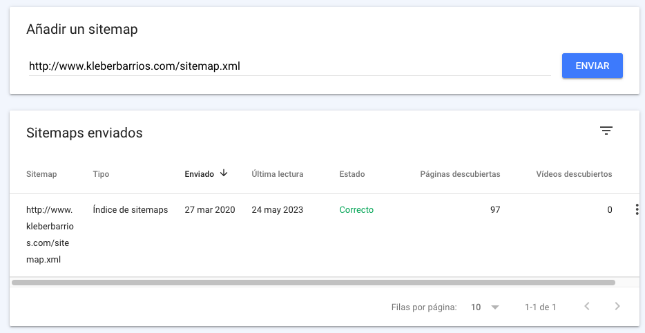 Tras crear nuestro sitemap enviaremos la URL a través de la consola de Google, la url debería ser https://www.kleberbarrios.com/sitemap_index.xml cambiamos la dirección con nuestro dominio web.