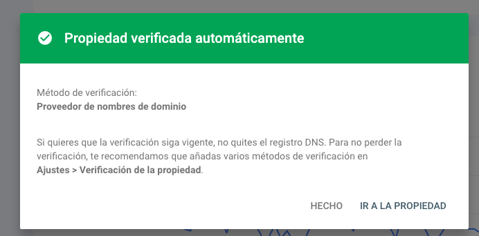Una vez completamos la verificación veremos el mensaje de propiedad verificada e iremos al dashboard de la herramienta.