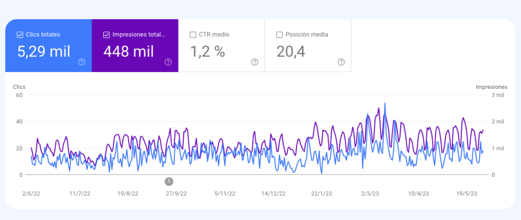 Lo primero que encontraremos al verificar nuestra propiedad son las impresiones, clics y CTR que recibe nuestro sitio web cada vez que un usuario realiza una consulta en Google.
